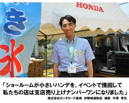 群馬県に6店舗を持つホンダ車ディーラー「ホンダカーズ高崎」の支店売上げナンバーワン「伊勢崎連取店」は、上州物産の模擬店レンタルをイベント開催のたびに利用している。今回、夏のイベントではかき氷機をレンタルし、来店のお客さまに大好評を得ているという同店を訪問、担当者の中澤課長にイベント成功の秘訣などについてお話を伺った。